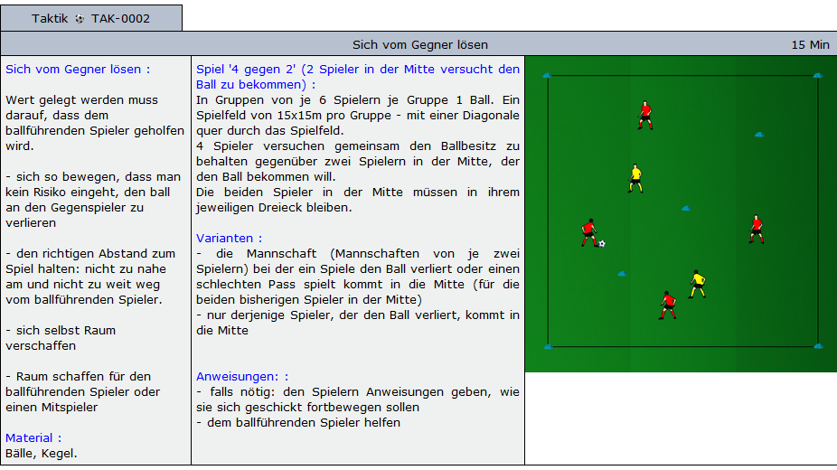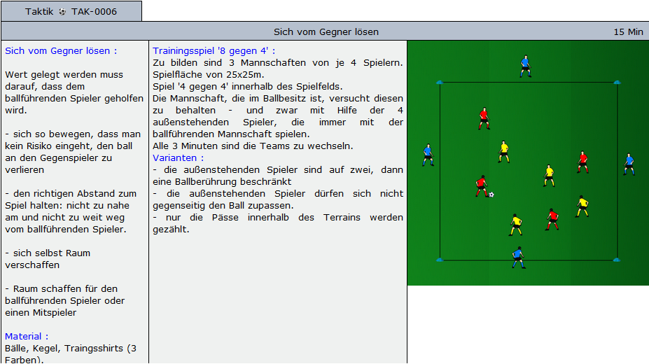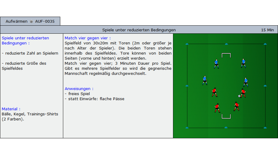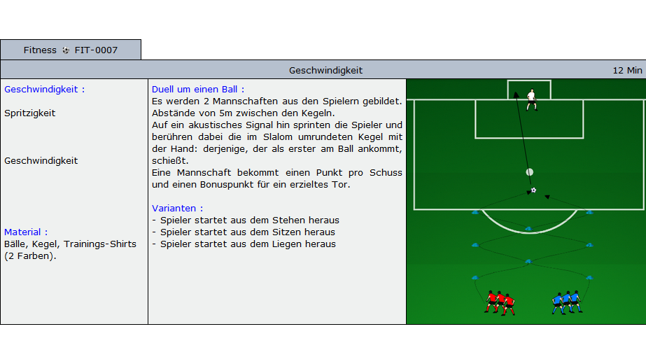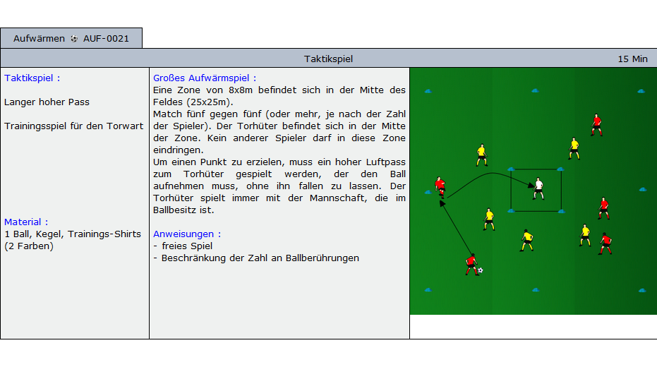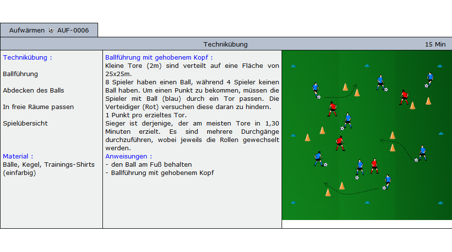 Beispiele für Übungen die im Soccer-Trainer Online enthalten sind: Aufwärmübungen, Fitnessübungen, technische und taktische Übungen und Spiele für alle Alterskategorien.